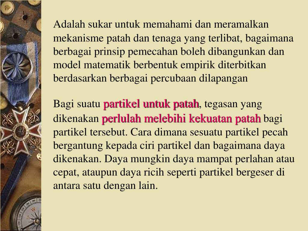 Adalah sukar untuk memahami dan meramalkan mekanisme patah dan tenaga yang terlibat, bagaimana berbagai prinsip pemecahan boleh dibangunkan dan model matematik berbentuk empirik diterbitkan berdasarkan berbagai percubaan dilapangan Bagi suatu partikel untuk patah, tegasan yang dikenakan perlulah melebihi kekuatan patah bagi partikel tersebut. Cara dimana sesuatu partikel pecah bergantung kepada ciri partikel dan bagaimana daya dikenakan. Daya mungkin daya mampat perlahan atau cepat, ataupun daya ricih seperti partikel bergeser di antara satu dengan lain.
