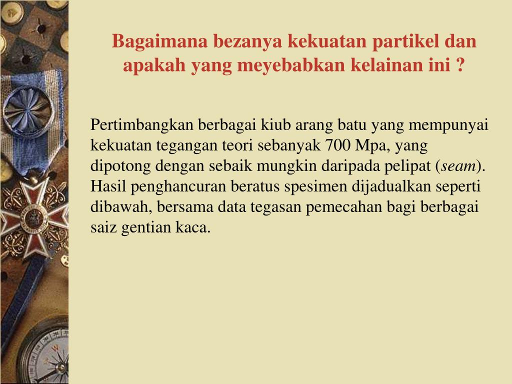Bagaimana bezanya kekuatan partikel dan apakah yang meyebabkan kelainan ini ? Pertimbangkan berbagai kiub arang batu yang mempunyai kekuatan tegangan teori sebanyak 700 Mpa, yang dipotong dengan sebaik mungkin daripada pelipat (seam). Hasil penghancuran beratus spesimen dijadualkan seperti dibawah, bersama data tegasan pemecahan bagi berbagai saiz gentian kaca.