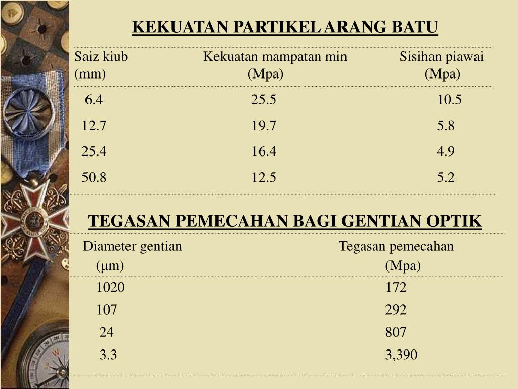 KEKUATAN PARTIKEL ARANG BATU Saiz kiub Kekuatan mampatan min Sisihan piawai (mm) (Mpa) (Mpa) 6.4 25.5 10.5 12.7 19.7 5.8 25.4 16.4 4.9 50.8 12.5 5.2 TEGASAN PEMECAHAN BAGI GENTIAN OPTIK Diameter gentian Tegasan pemecahan (μm) (Mpa) 1020 172 107 292 24 807 3.3 3,390