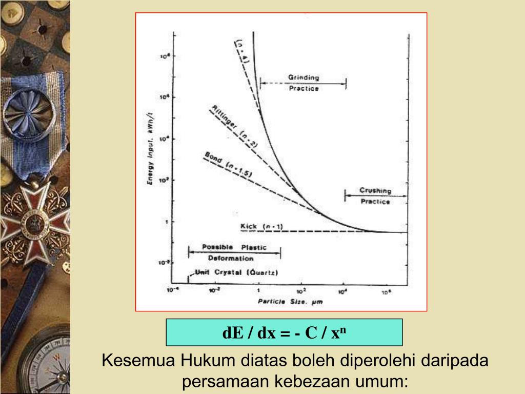 dimana dE adalah tenaga yang diperlukan untuk memberi kesan terhadap sebarang perubahan dx didalam saiz partikel. Dengan menetapkan : n = 2 dan pengkamilan memberikan hukum Rittinger, n = 1 dan pengkamilan memberikan hukum Kick n = 3/2 dan pengkamilan memberikan Hukum Bond.