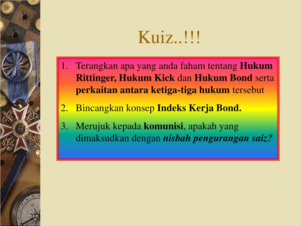 Kuiz..!!! • Terangkan apa yang anda faham tentang Hukum Rittinger, Hukum Kick dan Hukum Bond serta perkaitan antara ketiga-tiga hukum tersebut • Bincangkan konsep Indeks Kerja Bond. • Merujuk kepada komunisi, apakah yang dimaksudkan dengan nisbah pengurangan saiz?