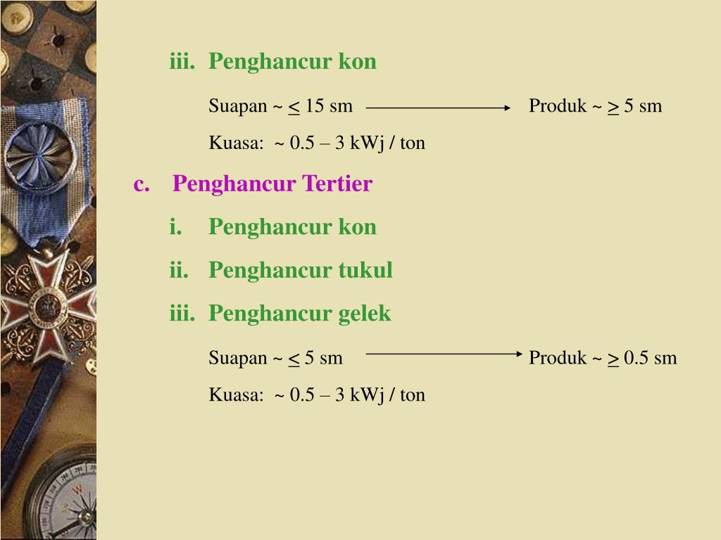 Penghancur kon • Suapan ~ < 15 sm Produk ~ > 5 sm • Kuasa: ~ 0.5 – 3 kWj / ton • Penghancur Tertier • Penghancur kon • Penghancur tukul • Penghancur gelek • Suapan ~ < 5 sm Produk ~ > 0.5 sm • Kuasa: ~ 0.5 – 3 kWj / ton