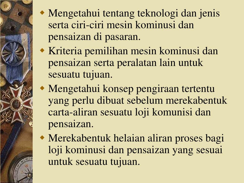 Mengetahui tentang teknologi dan jenis serta ciri-ciri mesin kominusi dan pensaizan di pasaran. • Kriteria pemilihan mesin kominusi dan pensaizan serta peralatan lain untuk sesuatu tujuan. • Mengetahui konsep pengiraan tertentu yang perlu dibuat sebelum merekabentuk carta-aliran sesuatu loji komunisi dan pensaizan. • Merekabentuk helaian aliran proses bagi loji kominusi dan pensaizan yang sesuai untuk sesuatu tujuan.
