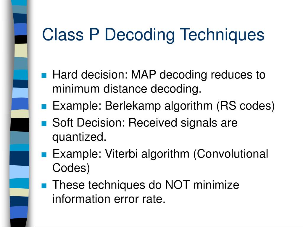 Class P Decoding Techniques • Hard decision: MAP decoding reduces to minimum distance decoding. • Example: Berlekamp algorithm (RS codes) • Soft Decision: Received signals are quantized. • Example: Viterbi algorithm (Convolutional Codes) • These techniques do NOT minimize information error rate.