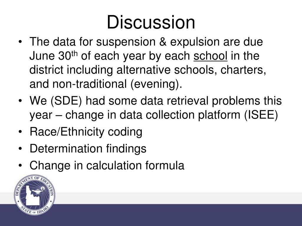 Discussion • The data for suspension & expulsion are due June 30th of each year by each school in the district including alternative schools, charters, and non-traditional (evening). • We (SDE) had some data retrieval problems this year – change in data collection platform (ISEE) • Race/Ethnicity coding • Determination findings • Change in calculation formula