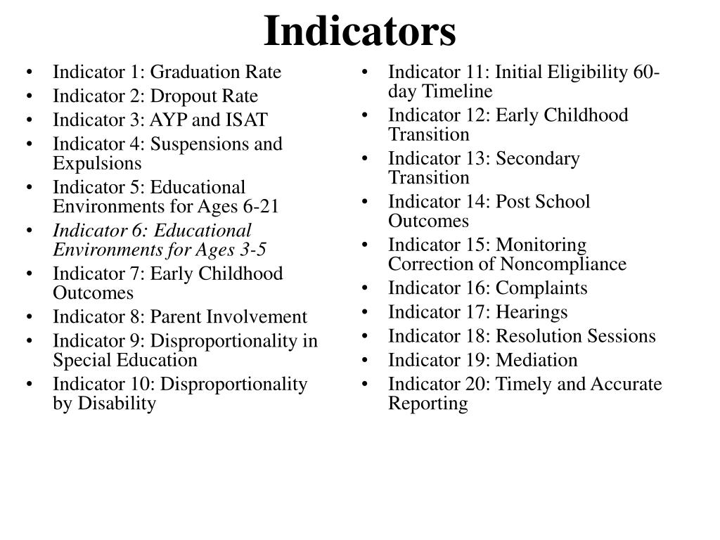 Indicators • Indicator 1: Graduation Rate • Indicator 2: Dropout Rate • Indicator 3: AYP and ISAT • Indicator 4: Suspensions and Expulsions • Indicator 5: Educational Environments for Ages 6-21 • Indicator 6: Educational Environments for Ages 3-5 • Indicator 7: Early Childhood Outcomes • Indicator 8: Parent Involvement • Indicator 9: Disproportionality in Special Education • Indicator 10: Disproportionality by Disability • Indicator 11: Initial Eligibility 60-day Timeline • Indicator 12: Early Childhood Transition • Indicator 13: Secondary Transition • Indicator 14: Post School Outcomes • Indicator 15: Monitoring Correction of Noncompliance • Indicator 16: Complaints • Indicator 17: Hearings • Indicator 18: Resolution Sessions • Indicator 19: Mediation • Indicator 20: Timely and Accurate Reporting