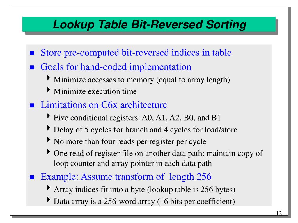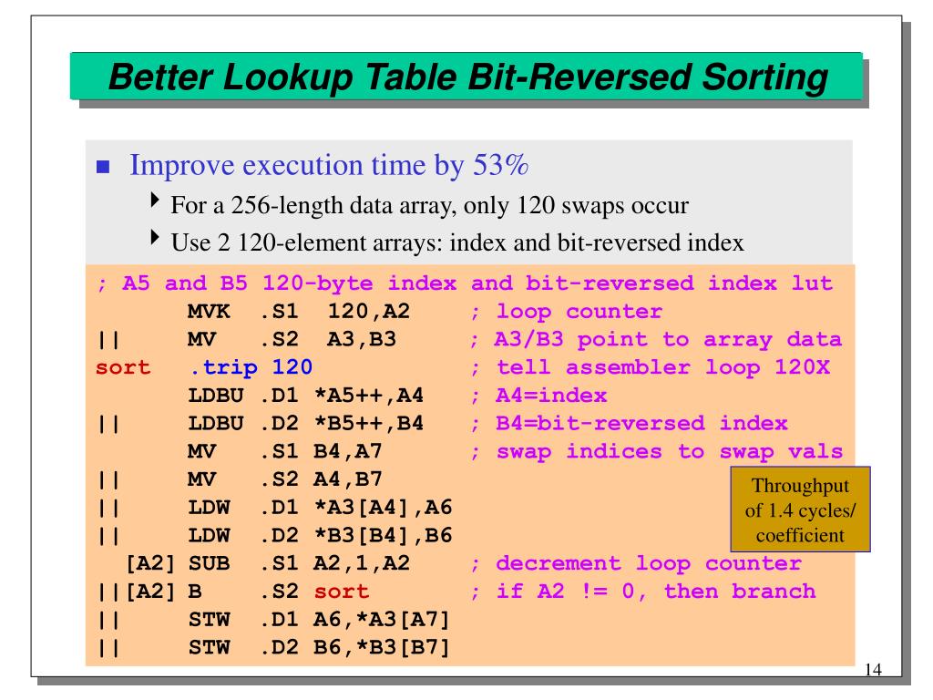 Lookup Table Bit-Reversed Sorting ; A3 256-word array, B5 256-byte bit-rev index lutMVK .S1 255,A2 ; index to swap 0 … 255|| MVK .S2 255,B2 ; 255 bit reversed is 255 || ZERO .L1 A1 ; don’t swap first index || MV .L2 A3,B3 ; B3 also points to data SUB .S1 A2,1,B1 ; B1=A2-1 sort.trip 255; tell assembler loop 255X [A2] LDBU .D2 *B5[B1],B7 ; B7=next bit-rev index[A2] SUB .S1 A2,1,A2 ; decrement loop counter ||[B1] SUB .S2 B1,1,B1 ; B1=A2-1 ||[A1] MV .L1 B2,A4 ; A4=B2 for swapping||[A1] MV .L2 A2,B4 ; B4=A2 for swapping||[A1] LDW .D1 *A3[A2],A6 ; A6=data at index||[A1] LDW .D2 *B3[B2],B6 ; B6=data at bit-rev index CMPGT .L1 A2,B7,A1 ; A1=switch next values || MV .L2 B7,B2 ; B2=bit-rev index ||[A1] STW .D1 A6,*A3[A4] ; swap data||[A1] STW .D2 B6,*B3[B4]||[A2] B .S2 sort; if A2 != 0, then branch Throughputof 3 cycles/coefficient