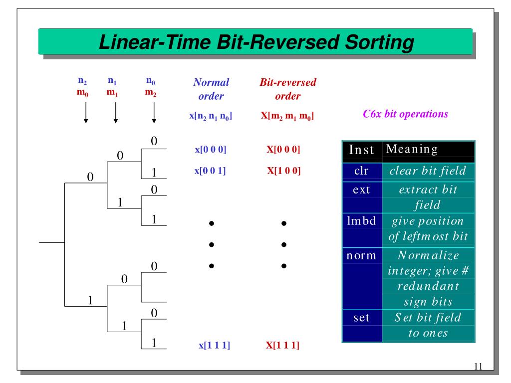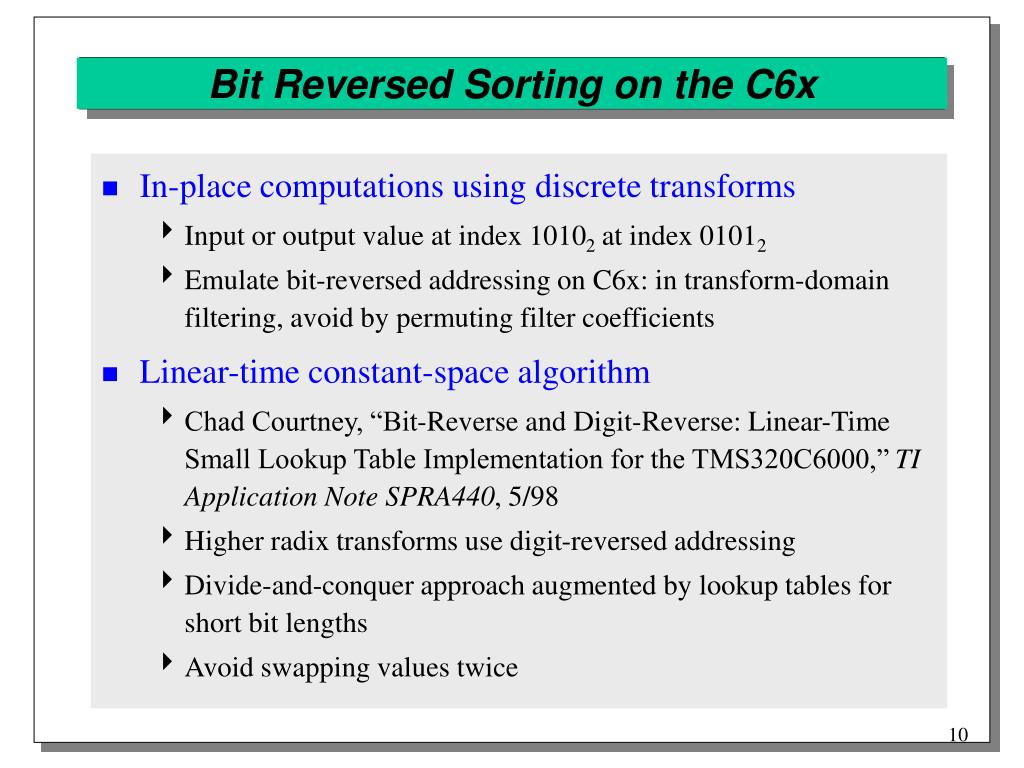 Linear-Time Bit-Reversed Sorting n2 m0 n1 m1 n0 m2 Normal order Bit-reversed order C6x bit operations x[n2 n1 n0] X[m2 m1 m0] 0 x[0 0 0] X[0 0 0] 0 1 x[0 0 1] X[1 0 0] 0 0 1 1 0 0 1 0 1 1 x[1 1 1] X[1 1 1]