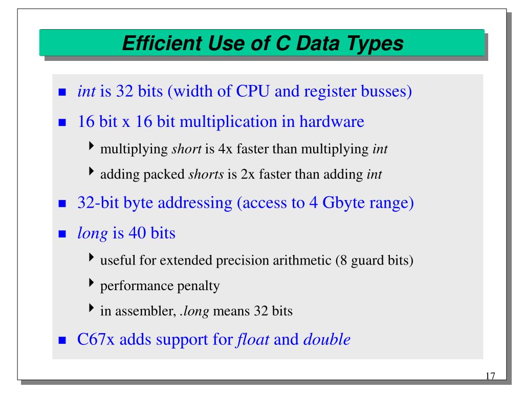 Efficient Use of C Data Types • int is 32 bits (width of CPU and register busses) • 16 bit x 16 bit multiplication in hardware • multiplying short is 4x faster than multiplying int • adding packed shorts is 2x faster than adding int • 32-bit byte addressing (access to 4 Gbyte range) • long is 40 bits • useful for extended precision arithmetic (8 guard bits) • performance penalty • in assembler, .long means 32 bits • C67x adds support for float and double