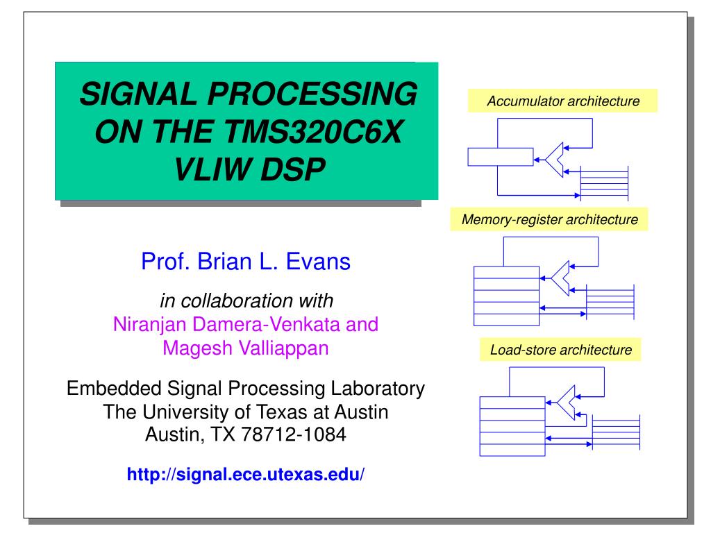 SIGNAL PROCESSING ON THE TMS320C6X VLIW DSP. Accumulator architecture. Memory-register architecture. Prof. Brian L. Evans in collaboration with Niranjan Damera-Venkata and Magesh Valliappan Embedded Signal Processing Laboratory The University of Texas at Austin Austin, TX 78712-1084
