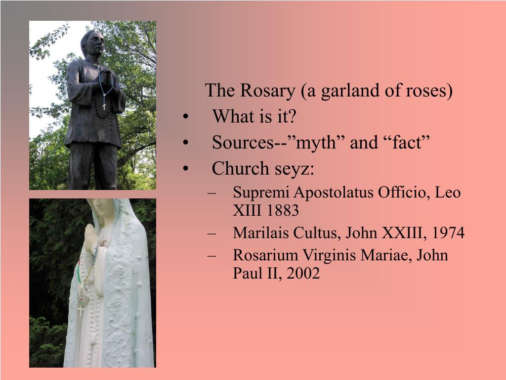 The Rosary (a garland of roses) • What is it? • Sources--”myth” and “fact” • Church seyz: • Supremi Apostolatus Officio, Leo XIII 1883 • Marilais Cultus, John XXIII, 1974 • Rosarium Virginis Mariae, John Paul II, 2002