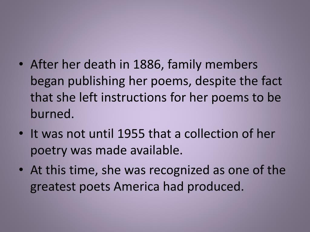 After her death in 1886, family members began publishing her poems, despite the fact that she left instructions for her poems to be burned. • It was not until 1955 that a collection of her poetry was made available. • At this time, she was recognized as one of the greatest poets America had produced.