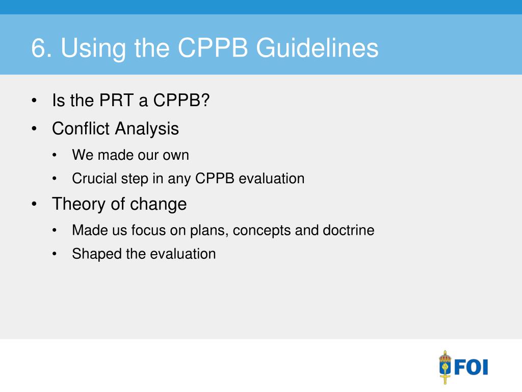 6. Using the CPPB Guidelines Is the PRT a CPPB? Conflict Analysis We made our own Crucial step in any CPPB evaluation Theory of change Made us focus on plans, concepts and doctrine Shaped the evaluation