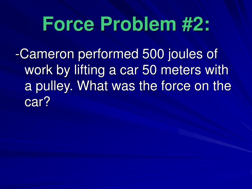 Force Problem #2: -Cameron performed 500 joules of work by lifting a car 50 meters with a pulley. What was the force on the car?