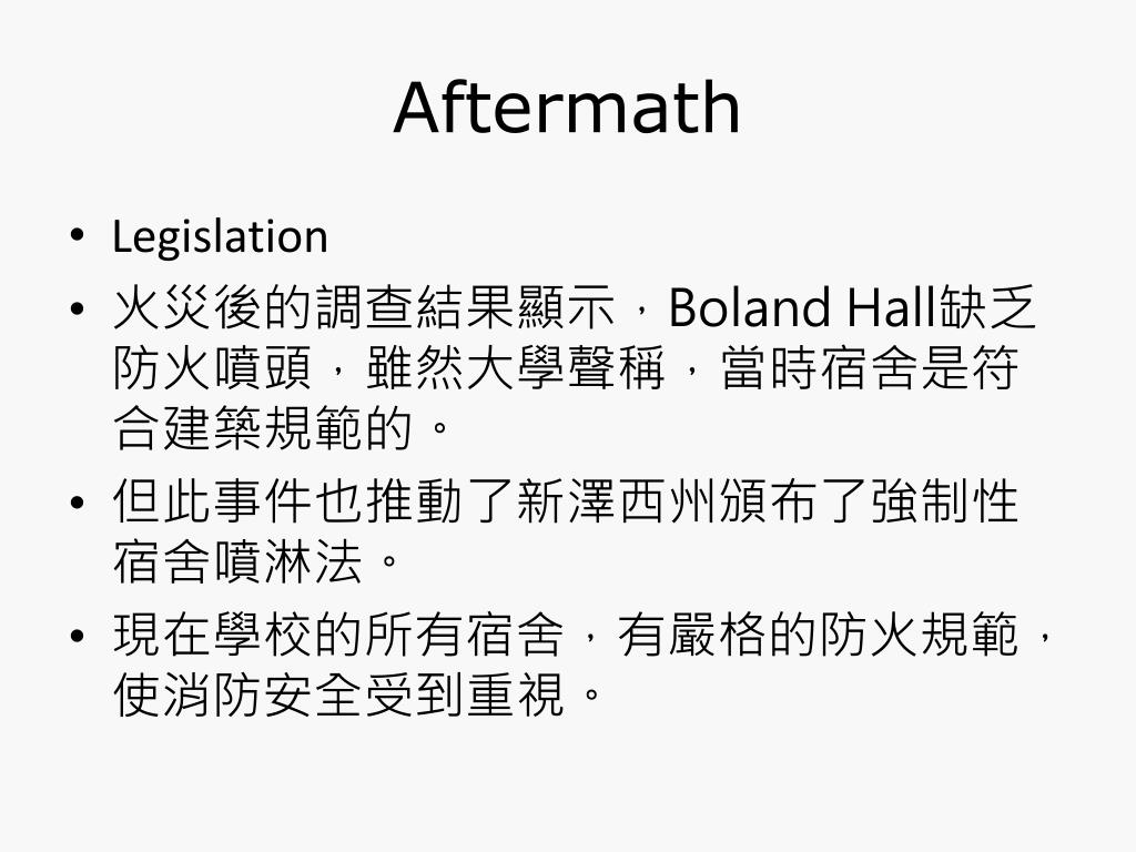 Aftermath • Legislation • 火災後的調查結果顯示,Boland Hall缺乏防火噴頭,雖然大學聲稱,當時宿舍是符合建築規範的。 • 但此事件也推動了新澤西州頒布了強制性宿舍噴淋法。 • 現在學校的所有宿舍,有嚴格的防火規範,使消防安全受到重視。