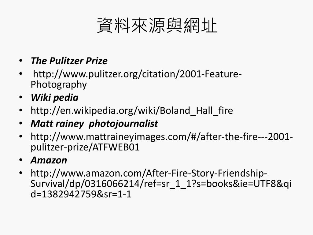 資料來源與網址 • The Pulitzer Prize • http://www.pulitzer.org/citation/2001-Feature-Photography • Wiki pedia • http://en.wikipedia.org/wiki/Boland_Hall_fire • Matt rainey photojournalist • http://www.mattraineyimages.com/#/after-the-fire---2001-pulitzer-prize/ATFWEB01 • Amazon • http://www.amazon.com/After-Fire-Story-Friendship-Survival/dp/0316066214/ref=sr_1_1?s=books&ie=UTF8&qid=1382942759&sr=1-1
