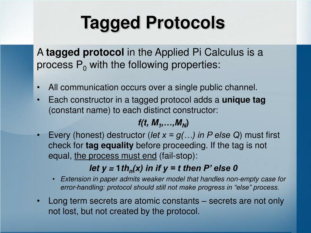Tagged Protocols A tagged protocol in the Applied Pi Calculus is a process P0 with the following properties: • All communication occurs over a single public channel. • Each constructor in a tagged protocol adds a unique tag (constant name) to each distinct constructor: • f(t, M1,…,MN) • Every (honest) destructor (let x = g(…) in P else Q) must first check for tag equality before proceeding. If the tag is not equal, the process must end (fail-stop): • let y = 1thn(x) in if y = t then P’ else 0 • Extension in paper admits weaker model that handles non-empty case for error-handling: protocol should still not make progress in “else” process. • Long term secrets are atomic constants – secrets are not only not lost, but not created by the protocol.