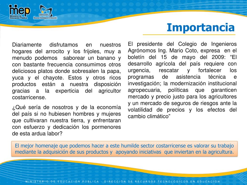 Importancia El presidente del Colegio de Ingenieros Agrónomos Ing. Mario Coto, expresa en el boletín del 15 de mayo del 2009: “El desarrollo agrícola del país requiere con urgencia, rescatar y fortalecer los programas de asistencia técnica e investigación; la modernización institucional agropecuaria, políticas que garanticen mercado y precio justo para los agricultores y un mercado de seguros de riesgos ante la volatilidad de precios y los efectos del cambio climático” Diariamente disfrutamos en nuestros hogares del arrocito y los frijoles, muy a menudo podemos saborear un banano y con bastante frecuencia consumimos otros deliciosos platos donde sobresalen la papa, yuca y el chayote. Estos y otros ricos productos están a nuestra disposición gracias a la experticia del agricultor costarricense. ¿Qué sería de nosotros y de la economía del país si no hubiesen hombres y mujeres que cultivaran nuestra tierra, y enfrentaran con esfuerzo y dedicación los pormenores de esta ardua labor? El mejor homenaje que podemos hacer a este humilde sector costarricense es valorar su trabajo mediante la adquisición de sus productos y apoyando iniciativas que inviertan en la agricultura.