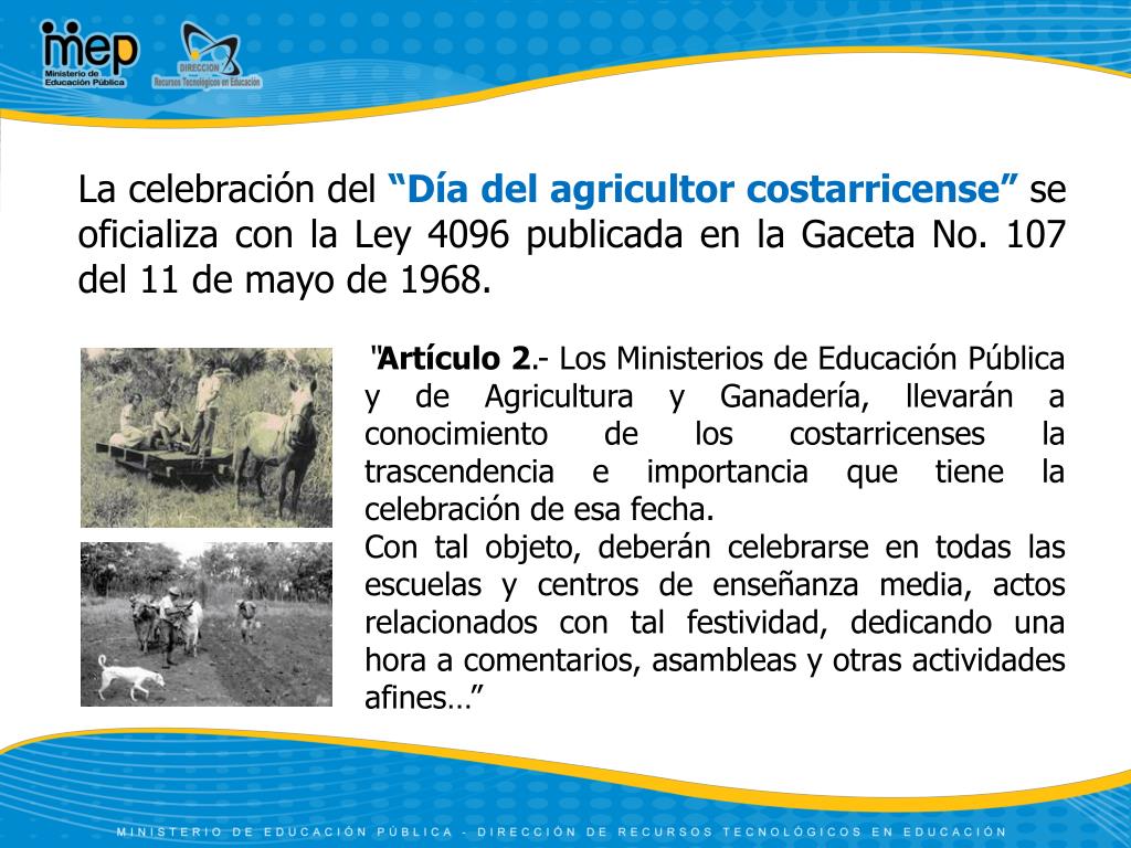 La celebración del “Día del agricultor costarricense” se oficializa con la Ley 4096 publicada en la Gaceta No. 107 del 11 de mayo de 1968. “Artículo 2.- Los Ministerios de Educación Pública y de Agricultura y Ganadería, llevarán a conocimiento de los costarricenses la trascendencia e importancia que tiene la celebración de esa fecha. Con tal objeto, deberán celebrarse en todas las escuelas y centros de enseñanza media, actos relacionados con tal festividad, dedicando una hora a comentarios, asambleas y otras actividades afines…”