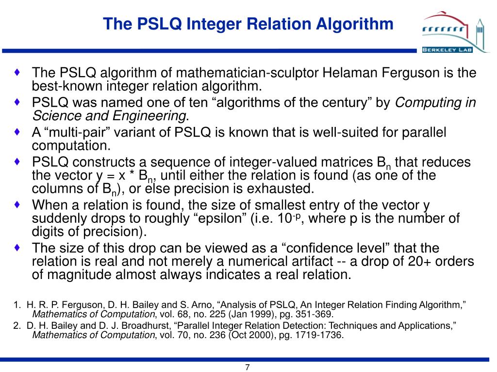 Typical Scenario for Using PSLQ in Experimental Mathematics • Compute the numerical value of some constant alpha to high precision (typically several hundred digits). • Examples of alpha: limit of sequence, sum of infinite series, value of definite integral, result of minimization or maximization, etc. • Conjecture, based on experience with related problems, the terms ti of an analytic formula that this constant might satisfy (with unknown integer or rational coefficients). • Compute the value of each of these terms to the same precision as alpha. • Form the vector X = (alpha, t1, t2, …, tn) as input to an integer relation finding algorithm. • If the algorithm finds an integer relation for X, then a formula for alpha can be found by simply solving the relation for alpha. • Even if no relation is found, PSLQ produces useful bounds on the size of any possible relation involving the given terms.