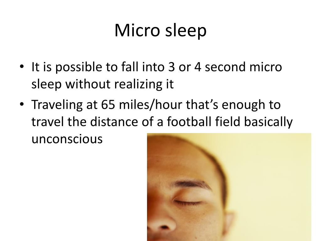 Micro sleep • It is possible to fall into 3 or 4 second micro sleep without realizing it • Traveling at 65 miles/hour that’s enough to travel the distance of a football field basically unconscious