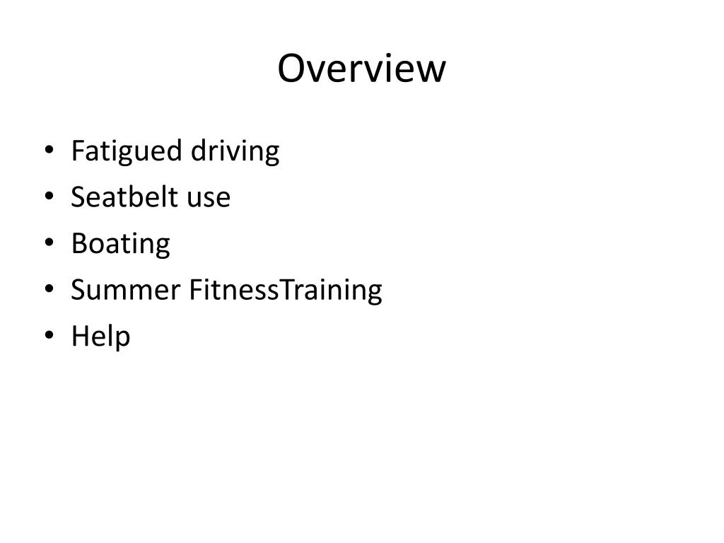 Overview • Fatigued driving • Seatbelt use • Boating • Summer FitnessTraining • Help