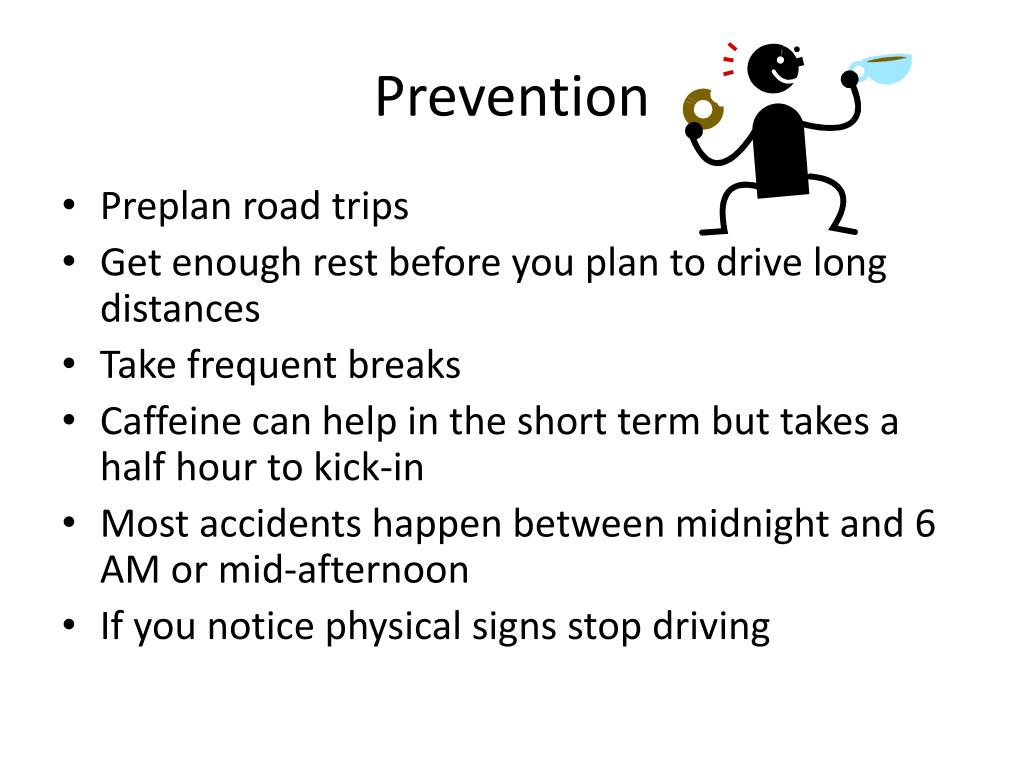 Prevention • Preplan road trips • Get enough rest before you plan to drive long distances • Take frequent breaks • Caffeine can help in the short term but takes a half hour to kick-in • Most accidents happen between midnight and 6 AM or mid-afternoon • If you notice physical signs stop driving