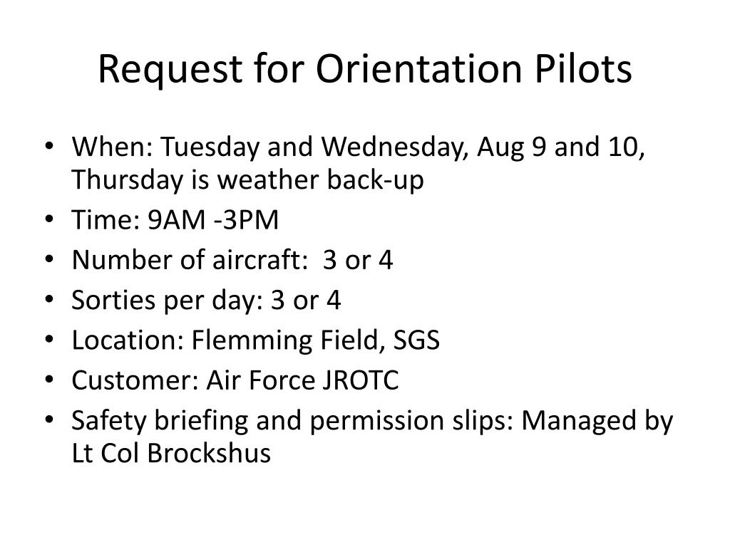 Request for Orientation Pilots • When: Tuesday and Wednesday, Aug 9 and 10, Thursday is weather back-up • Time: 9AM -3PM • Number of aircraft: 3 or 4 • Sorties per day: 3 or 4 • Location: Flemming Field, SGS • Customer: Air Force JROTC • Safety briefing and permission slips: Managed by Lt Col Brockshus