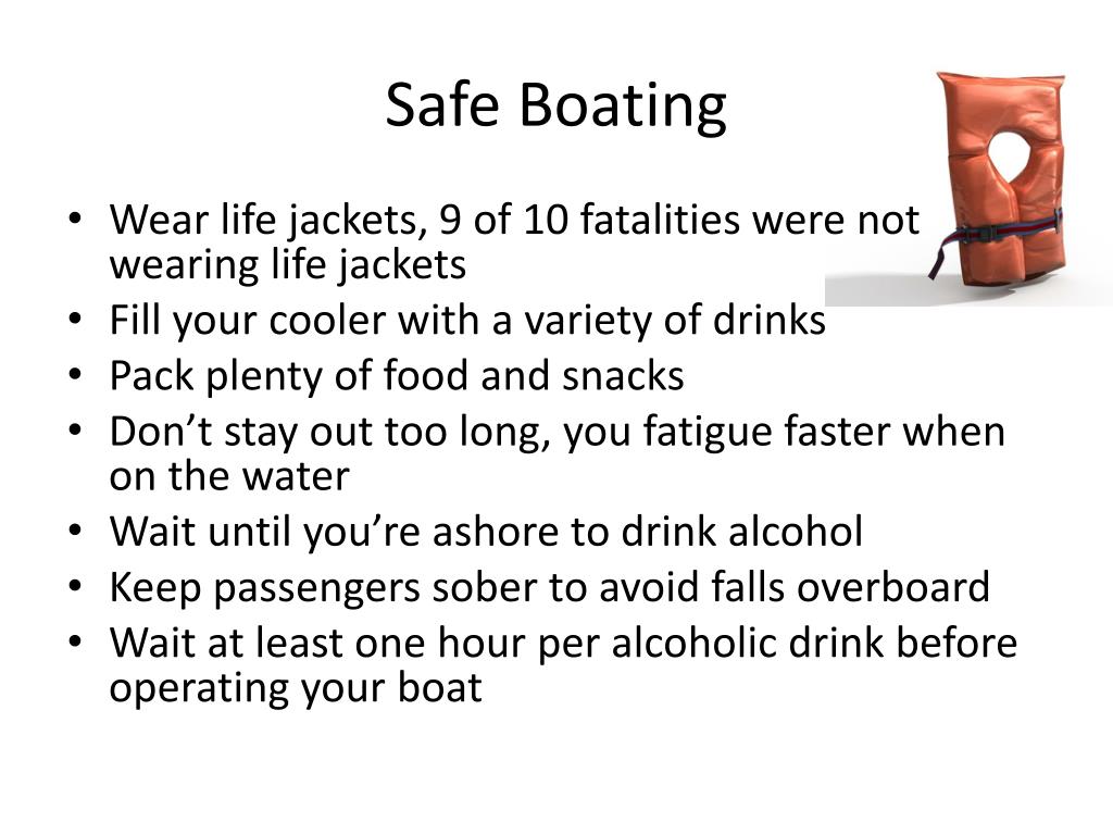 Safe Boating • Wear life jackets, 9 of 10 fatalities were not wearing life jackets • Fill your cooler with a variety of drinks • Pack plenty of food and snacks • Don’t stay out too long, you fatigue faster when on the water • Wait until you’re ashore to drink alcohol • Keep passengers sober to avoid falls overboard • Wait at least one hour per alcoholic drink before operating your boat