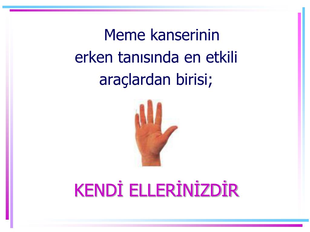 KENDİ KENDİNE MEME MUAYENESİ. Meme kanserinin erken tanısında en etkili araçlardan birisi;. KENDİ ELLERİNİZDİR. Kendi Kendine Meme Muayenesi. Yapılan çalışmalarda;