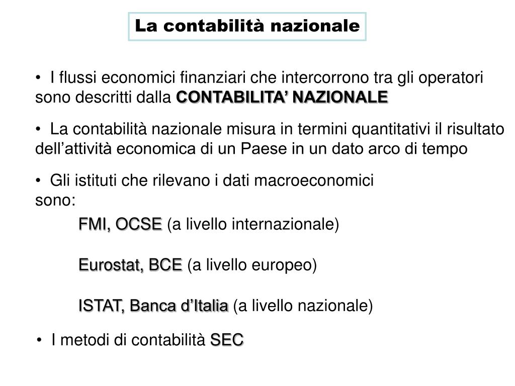 La contabilità nazionale • I flussi economici finanziari che intercorrono tra gli operatori sono descritti dalla CONTABILITA’ NAZIONALE • La contabilità nazionale misura in termini quantitativi il risultato dell’attività economica di un Paese in un dato arco di tempo • Gli istituti che rilevano i dati macroeconomici sono: FMI, OCSE (a livello internazionale) Eurostat, BCE (a livello europeo) ISTAT, Banca d’Italia (a livello nazionale) • I metodi di contabilità SEC