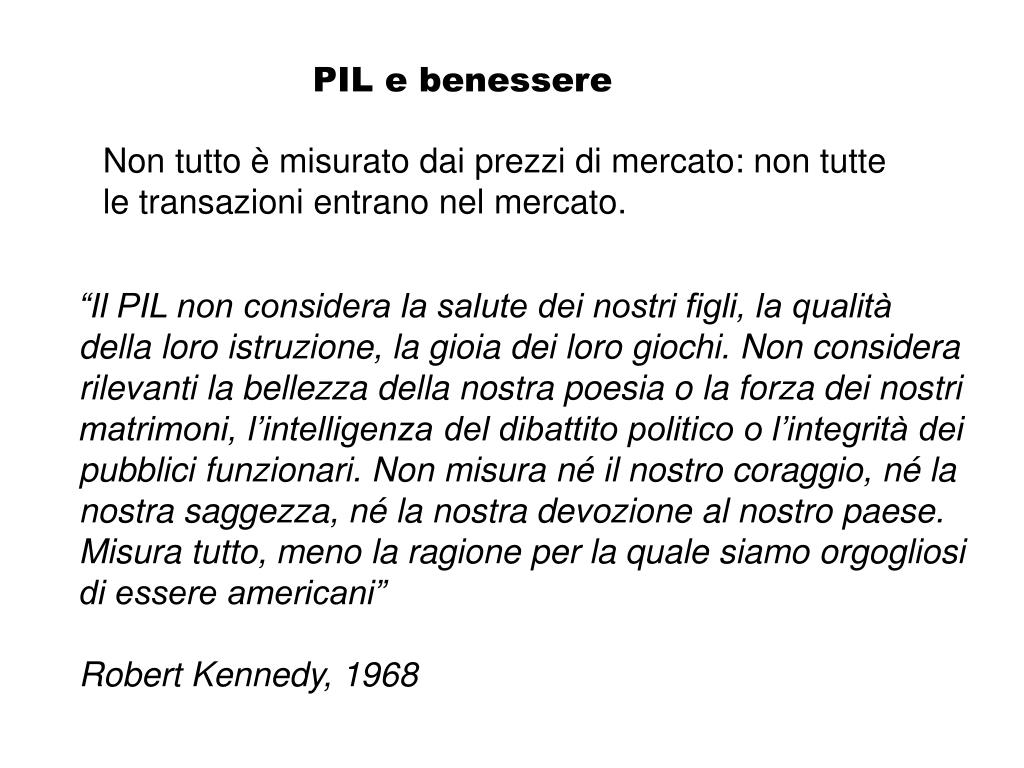 PIL e benessere Non tutto è misurato dai prezzi di mercato: non tutte le transazioni entrano nel mercato. “Il PIL non considera la salute dei nostri figli, la qualità della loro istruzione, la gioia dei loro giochi. Non considera rilevanti la bellezza della nostra poesia o la forza dei nostri matrimoni, l’intelligenza del dibattito politico o l’integrità dei pubblici funzionari. Non misura né il nostro coraggio, né la nostra saggezza, né la nostra devozione al nostro paese. Misura tutto, meno la ragione per la quale siamo orgogliosi di essere americani” Robert Kennedy, 1968