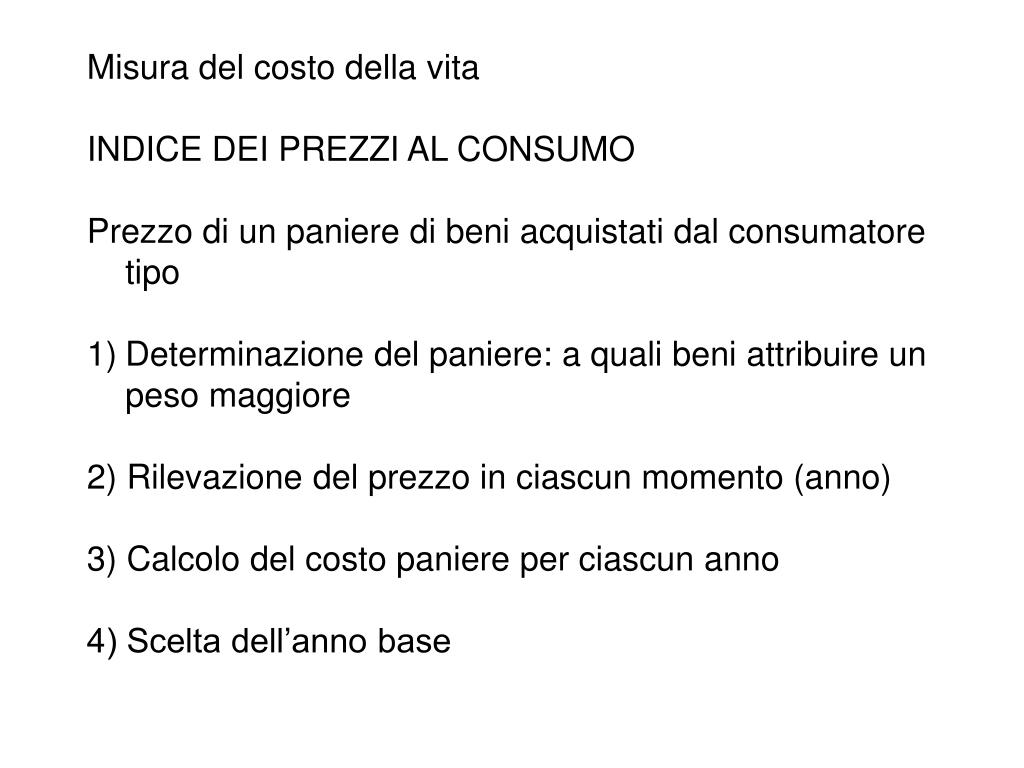 Misura del costo della vita • INDICE DEI PREZZI AL CONSUMO • Prezzo di un paniere di beni acquistati dal consumatore tipo • Determinazione del paniere: a quali beni attribuire un peso maggiore • 2) Rilevazione del prezzo in ciascun momento (anno) • 3) Calcolo del costo paniere per ciascun anno • 4) Scelta dell’anno base