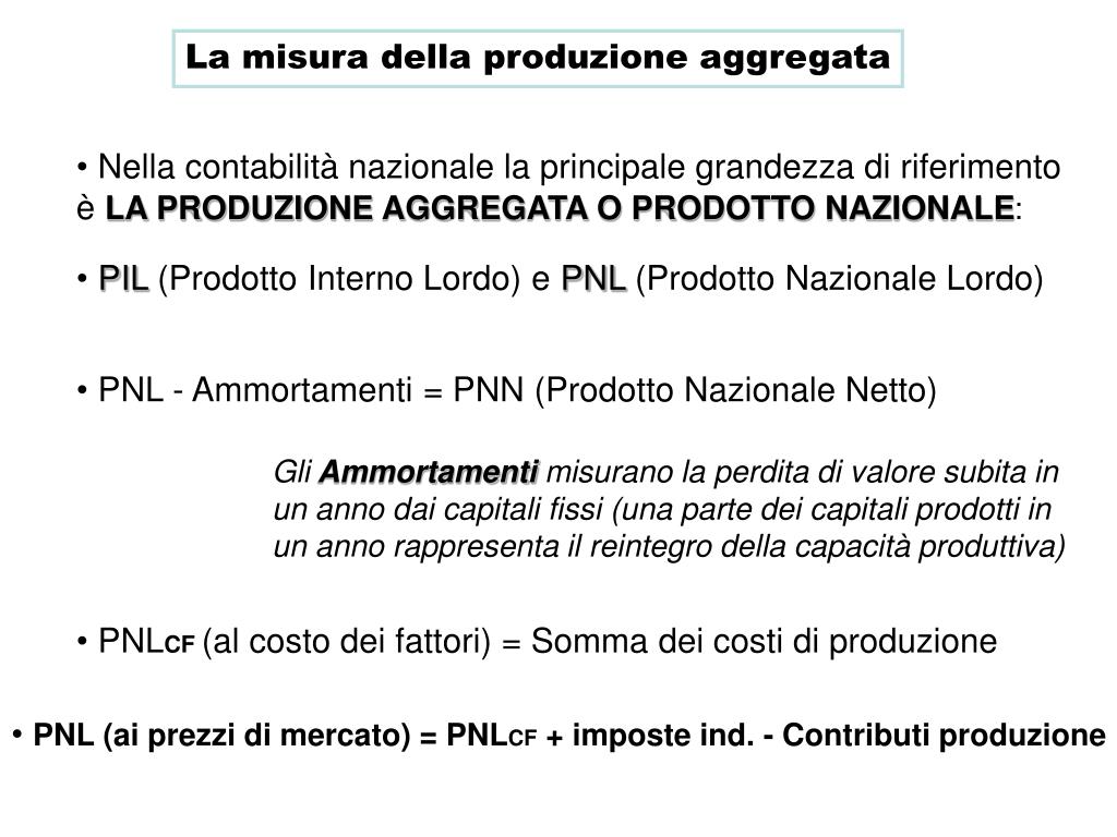 La misura della produzione aggregata • Nella contabilità nazionale la principale grandezza di riferimento è LA PRODUZIONE AGGREGATA O PRODOTTO NAZIONALE: • PIL (Prodotto Interno Lordo) e PNL (Prodotto Nazionale Lordo) • PNL - Ammortamenti = PNN (Prodotto Nazionale Netto) GliAmmortamenti misurano la perdita di valore subita in un anno dai capitali fissi (una parte dei capitali prodotti in un anno rappresenta il reintegro della capacità produttiva) • PNLCF (al costo dei fattori) = Somma dei costi di produzione • PNL (ai prezzi di mercato) = PNLCF + imposte ind. - Contributi produzione