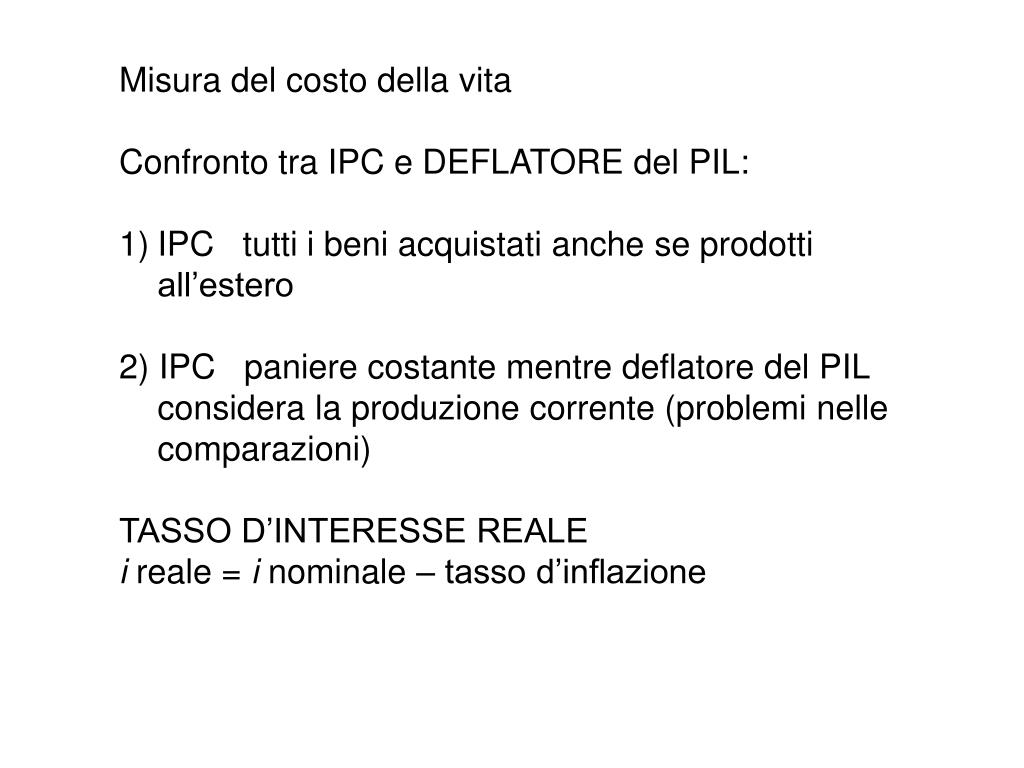 Misura del costo della vita • Confronto tra IPC e DEFLATORE del PIL: • IPC tutti i beni acquistati anche se prodotti all’estero • 2) IPC paniere costante mentre deflatore del PIL considera la produzione corrente (problemi nelle comparazioni) • TASSO D’INTERESSE REALE • i reale = i nominale – tasso d’inflazione