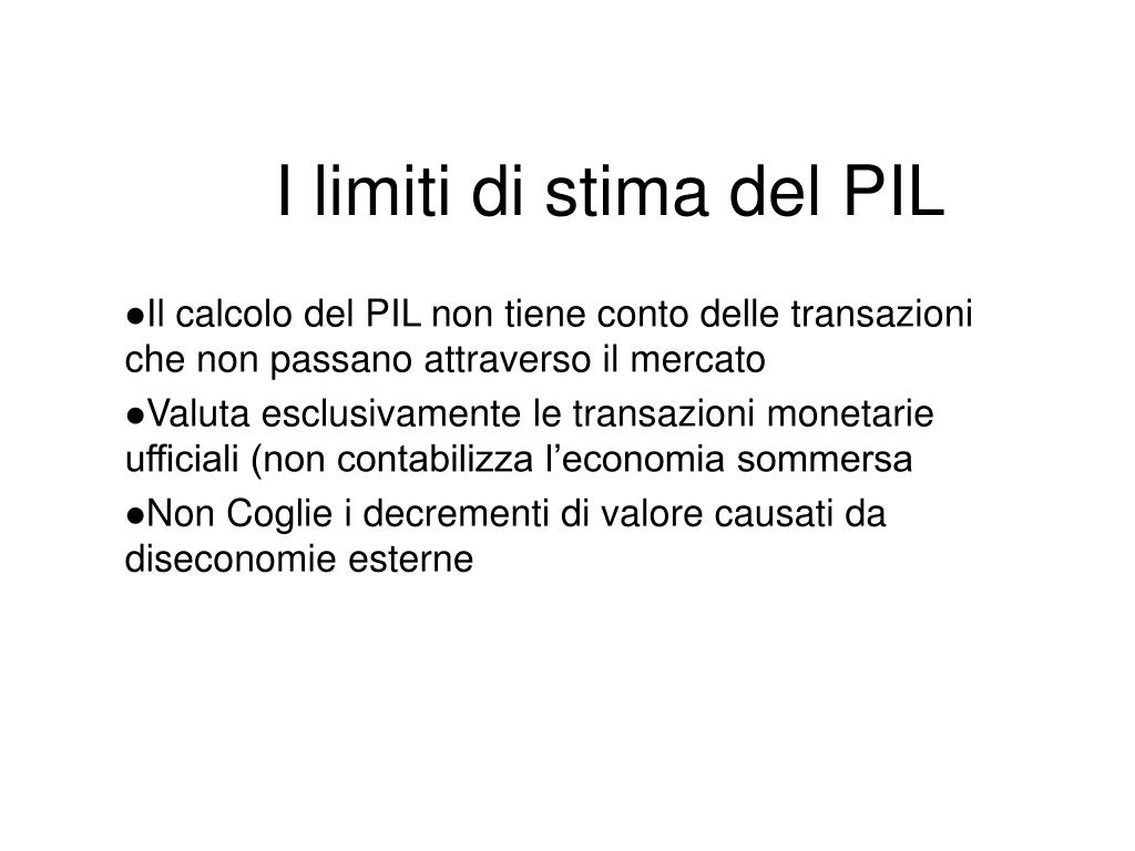 I limiti di stima del PIL • Il calcolo del PIL non tiene conto delle transazioni che non passano attraverso il mercato • Valuta esclusivamente le transazioni monetarie ufficiali (non contabilizza l’economia sommersa • Non Coglie i decrementi di valore causati da diseconomie esterne