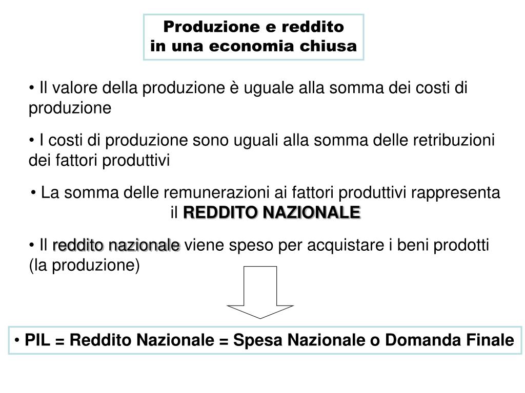 Produzione e reddito in una economia chiusa • Il valore della produzione è uguale alla somma dei costi di produzione • I costi di produzione sono uguali alla somma delle retribuzioni dei fattori produttivi • La somma delle remunerazioni ai fattori produttivi rappresenta il REDDITO NAZIONALE • Il reddito nazionale viene speso per acquistare i beni prodotti (la produzione) • PIL = Reddito Nazionale = Spesa Nazionale o Domanda Finale