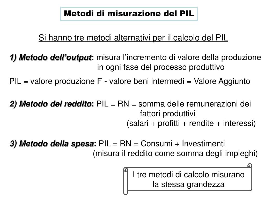 Metodi di misurazione del PIL Si hanno tre metodi alternativi per il calcolo del PIL 1) Metodo dell’output: misura l’incremento di valore della produzione in ogni fase del processo produttivo PIL = valore produzione F - valore beni intermedi = Valore Aggiunto 2) Metodo del reddito: PIL = RN = somma delle remunerazioni dei fattori produttivi (salari + profitti + rendite + interessi) 3) Metodo della spesa: PIL = RN = Consumi + Investimenti (misura il reddito come somma degli impieghi) I tre metodi di calcolo misurano la stessa grandezza