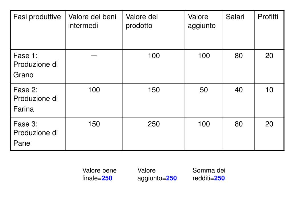 Valore bene finale=250 Valore aggiunto=250 Somma dei redditi=250