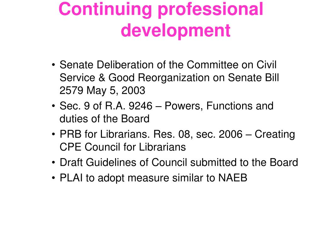 Continuing professional development • Senate Deliberation of the Committee on Civil Service & Good Reorganization on Senate Bill 2579 May 5, 2003 • Sec. 9 of R.A. 9246 – Powers, Functions and duties of the Board • PRB for Librarians. Res. 08, sec. 2006 – Creating CPE Council for Librarians • Draft Guidelines of Council submitted to the Board • PLAI to adopt measure similar to NAEB
