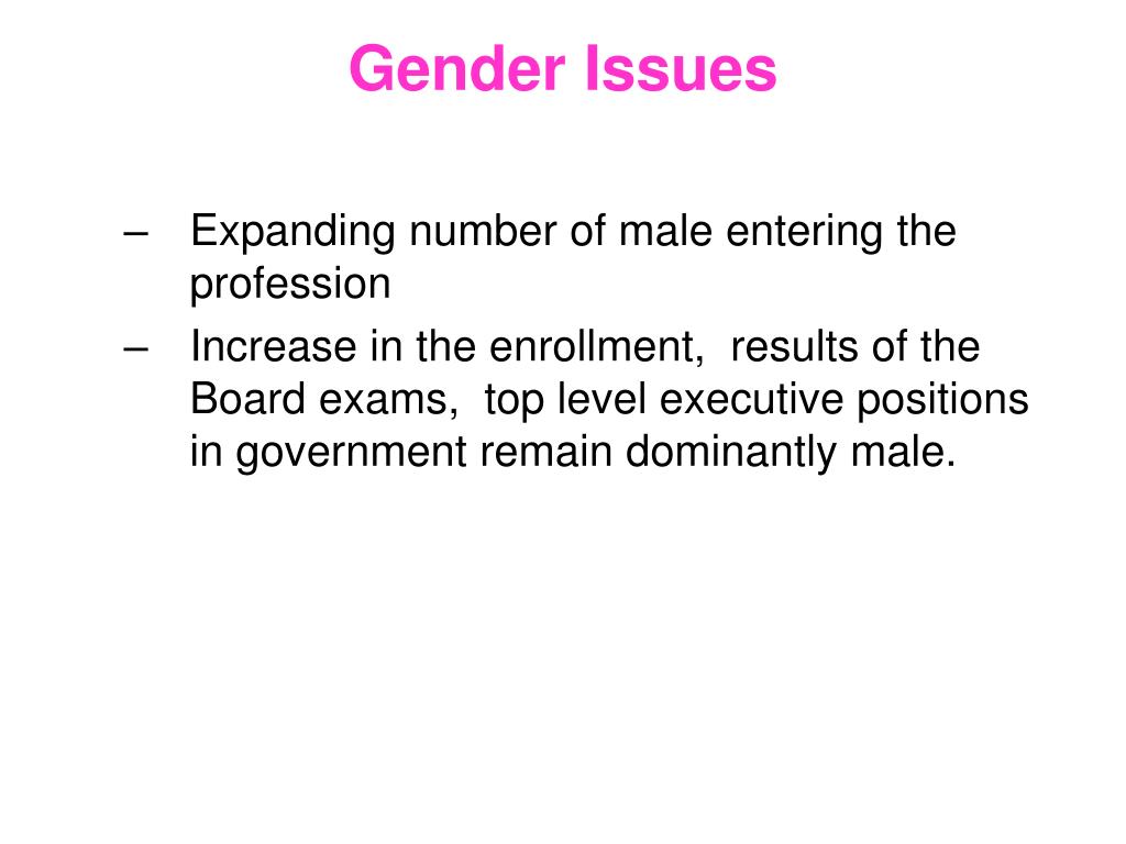 Gender Issues • Expanding number of male entering the profession • Increase in the enrollment, results of the Board exams, top level executive positions in government remain dominantly male.