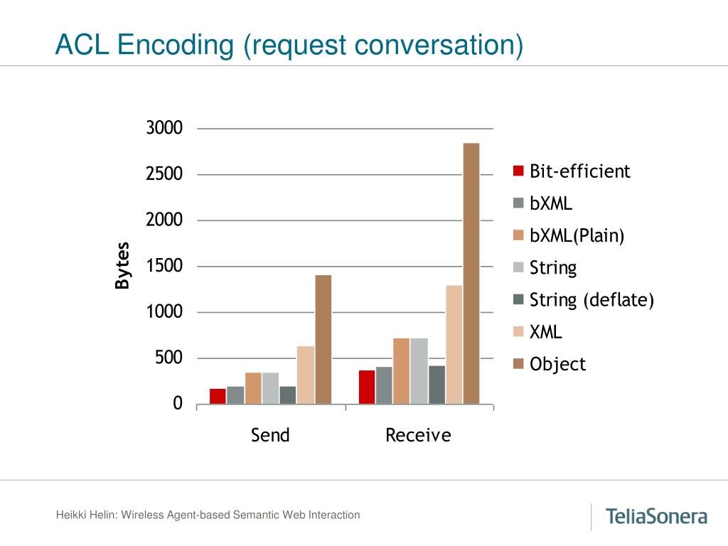 ACL Encoding • Options • String (s-expression), XML, Bit-efficient • Binary-XML (w/ special encoding tokens), Java Objects • Bit-Efficient encoding is the most efficient • Space-efficient • ...by definition • Time-efficient • much faster • nice for every application; not only for wireless • necessity for • high performance applications • highly utilized servers • simple parser appropriate for thin clients Heikki Helin: Wireless Agent-based Semantic Web Interaction