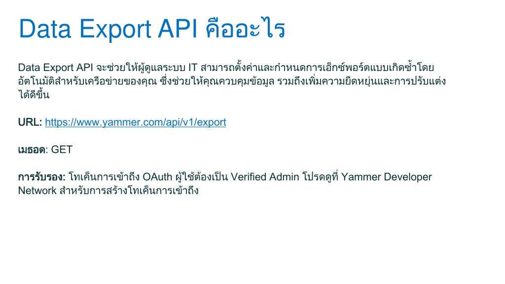 Data Export API คืออะไร • Data Export API จะช่วยให้ผู้ดูแลระบบ IT สามารถตั้งค่าและกำหนดการเอ็กซ์พอร์ตแบบเกิดซ้ำโดยอัตโนมัติสำหรับเครือข่ายของคุณ ซึ่งช่วยให้คุณควบคุมข้อมูลรวมถึงเพิ่มความยืดหยุ่นและการปรับแต่งได้ดีขึ้น • URL: https://www.yammer.com/api/v1/export • เมธอด: GET • การรับรอง: โทเค็นการเข้าถึงOAuthผู้ใช้ต้องเป็น Verified Admin โปรดดูที่ Yammer Developer Network สำหรับการสร้างโทเค็นการเข้าถึง