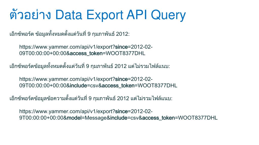 ตัวอย่างData Export API Query • เอ็กซ์พอร์ต ข้อมูลทั้งหมดตั้งแต่วันที่ 9 กุมภาพันธ์ 2012: • https://www.yammer.com/api/v1/export?since=2012-02-09T00:00:00+00:00&access_token=WOOT8377DHL • เอ็กซ์พอร์ตข้อมูลทั้งหมดตั้งแต่วันที่ 9 กุมภาพันธ์ 2012 แต่ไม่รวมไฟล์แนบ: • https://www.yammer.com/api/v1/export?since=2012-02-09T00:00:00+00:00&include=csv&access_token=WOOT8377DHL • เอ็กซ์พอร์ตข้อมูลข้อความตั้งแต่วันที่ 9 กุมภาพันธ์ 2012 แต่ไม่รวมไฟล์แนบ: • https://www.yammer.com/api/v1/export?since=2012-02-9T00:00:00+00:00&model=Message&include=csv&access_token=WOOT8377DHL