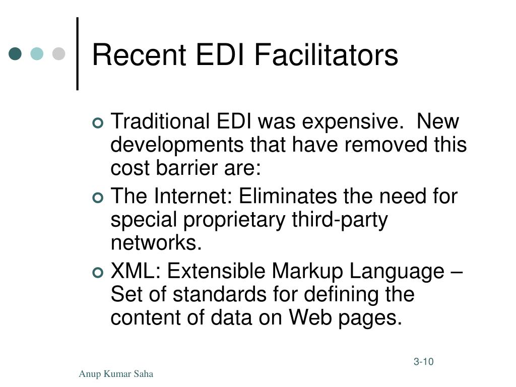 Recent EDI Facilitators • Traditional EDI was expensive. New developments that have removed this cost barrier are: • The Internet: Eliminates the need for special proprietary third-party networks. • XML: Extensible Markup Language – Set of standards for defining the content of data on Web pages.