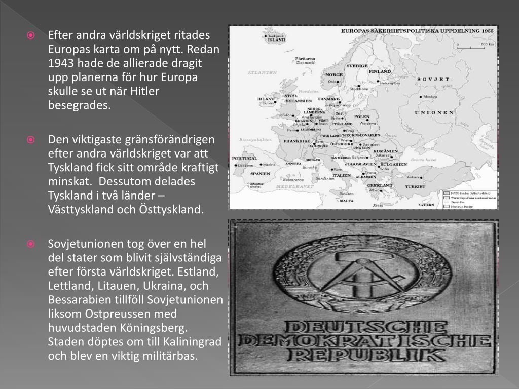 Efter andra världskriget ritades Europas karta om på nytt. Redan 1943 hade de allierade dragit upp planerna för hur Europa skulle se ut när Hitler besegrades. • Den viktigaste gränsförändrigen efter andra världskriget var att Tyskland fick sitt område kraftigt minskat. Dessutom delades Tyskland i två länder – Västtyskland och Östtyskland. • Sovjetunionen tog över en hel del stater som blivit självständiga efter första världskriget. Estland, Lettland, Litauen, Ukraina, och Bessarabien tillföll Sovjetunionen liksom Ostpreussen med huvudstaden Köningsberg. Staden döptes om till Kaliningrad och blev en viktig militärbas.