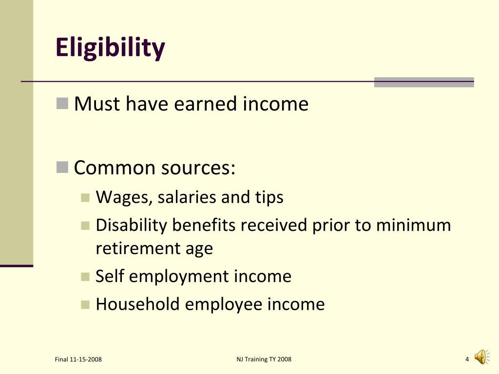 Eligibility • Must have earned income • Common sources: • Wages, salaries and tips • Disability benefits received prior to minimum retirement age • Self employment income • Household employee income NJ Training TY 2008