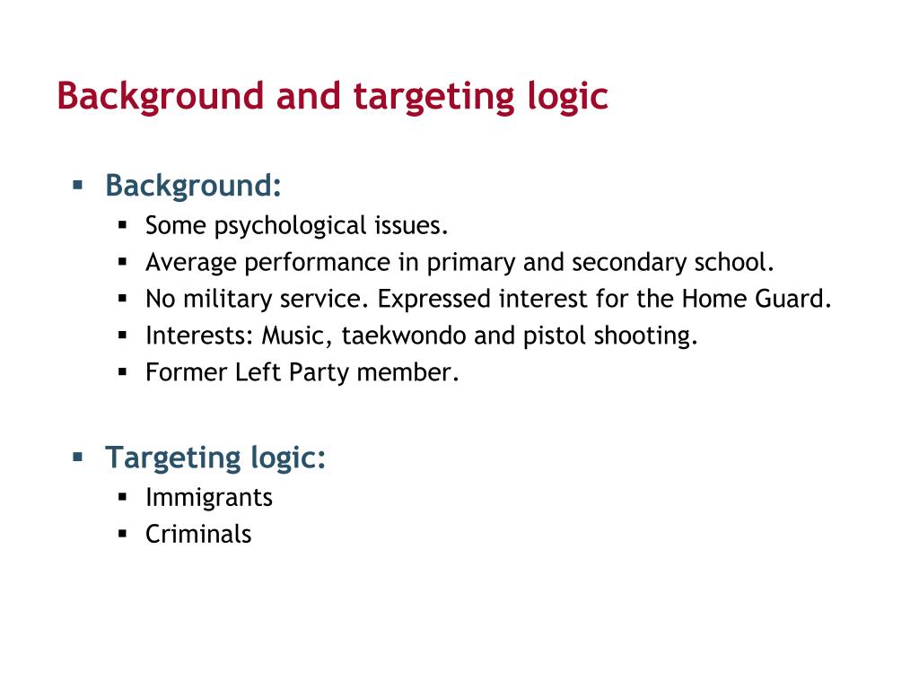 Background and targetinglogic • Background: • Somepsychologicalissues. • Averageperformance in primary and secondaryschool. • No militaryservice. Expressedinterest for the Home Guard. • Interests: Music, taekwondo and pistol shooting. • Former Left Party member. • Targetinglogic: • Immigrants • Criminals