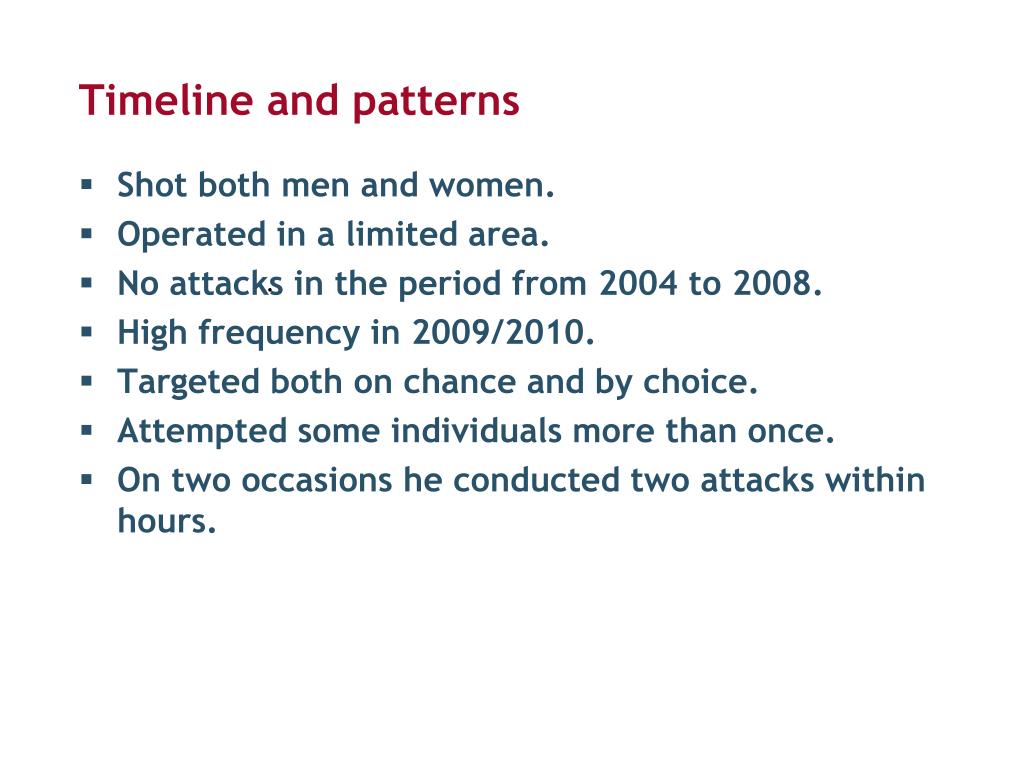 Timeline and patterns • Shotboth men and women. • Operated in a limited area. • No attacks in theperiod from 2004 to 2008. • High frequency in 2009/2010. • Targetedbothonchance and by choice. • Attempted some individuals more than once. • On two occasions he conducted two attacks within hours. .