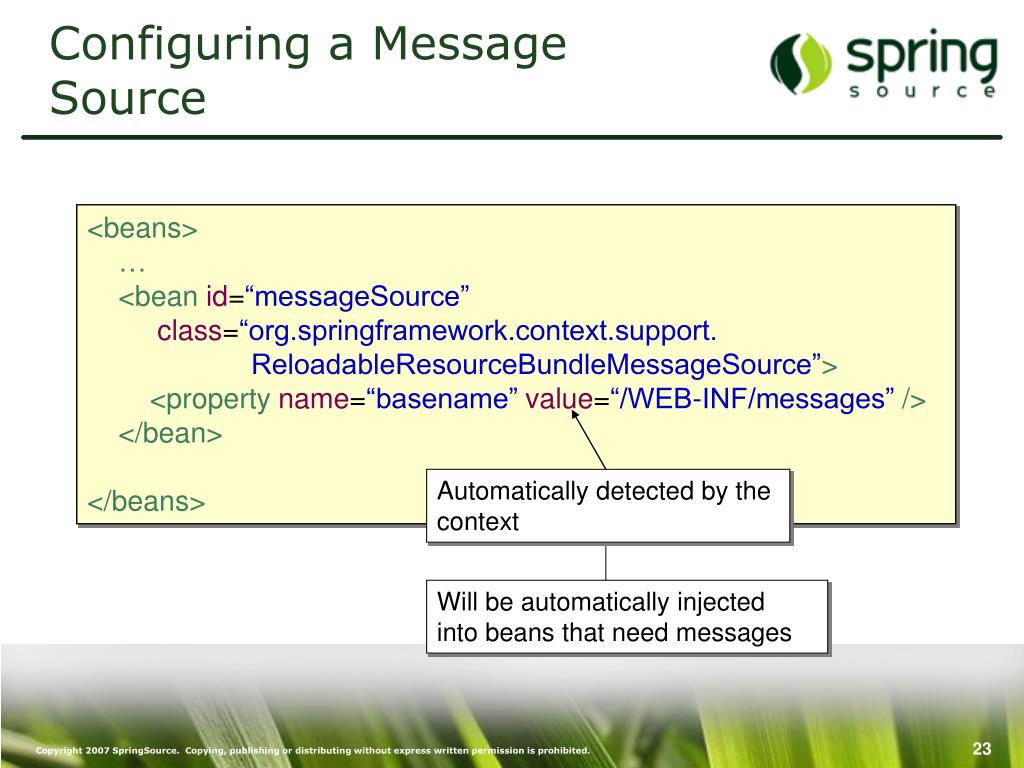 Configuring a Message Source <beans> … <beanid=“messageSource” class=“org.springframework.context.support. ReloadableResourceBundleMessageSource”> <propertyname=“basename”value=“/WEB-INF/messages” /> </bean> </beans> Automatically detected by the context Will be automatically injected into beans that need messages